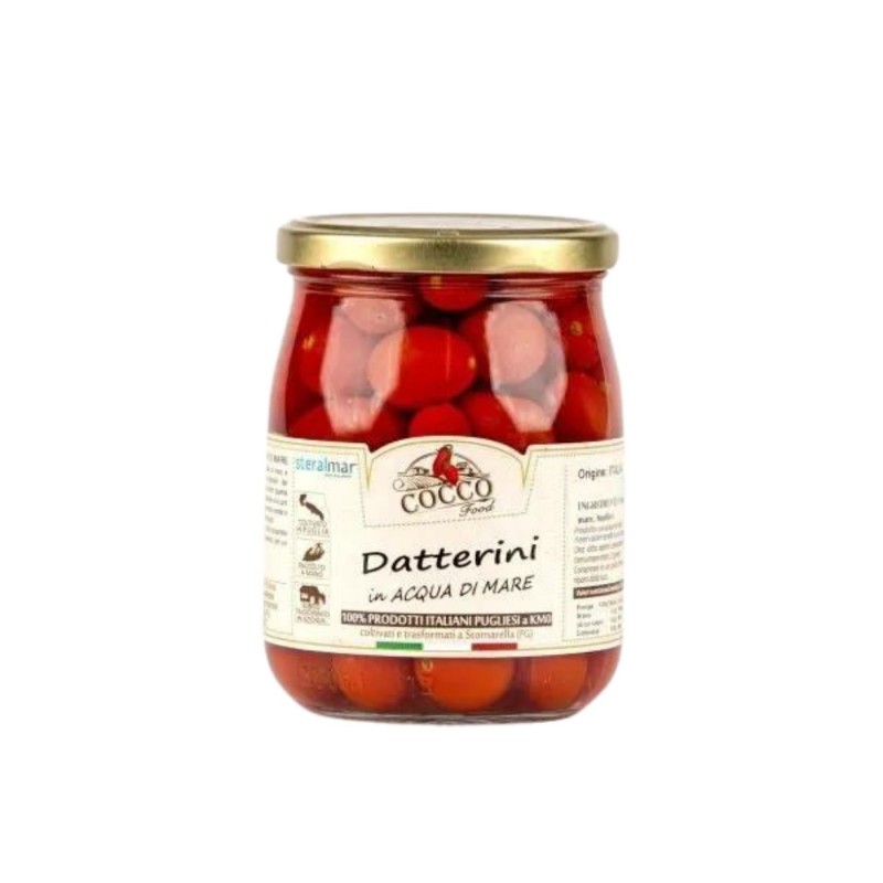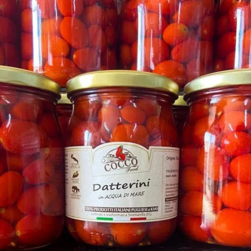 Datterini in Acqua di Mare di Cocco Food, un prodotto che unisce la dolcezza dei pomodori datterini coltivati in Puglia con la ricchezza salina dell'acqua di mare.